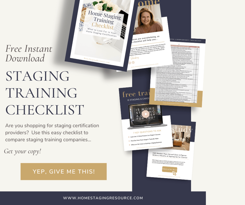If you're looking into the staging industry or just want to up-level your business, I also created a handy "Staging Training Comparison Cheat Sheet" or β checklist, so you have a helpful tool for evaluating which staging and redesign certification course to invest in...